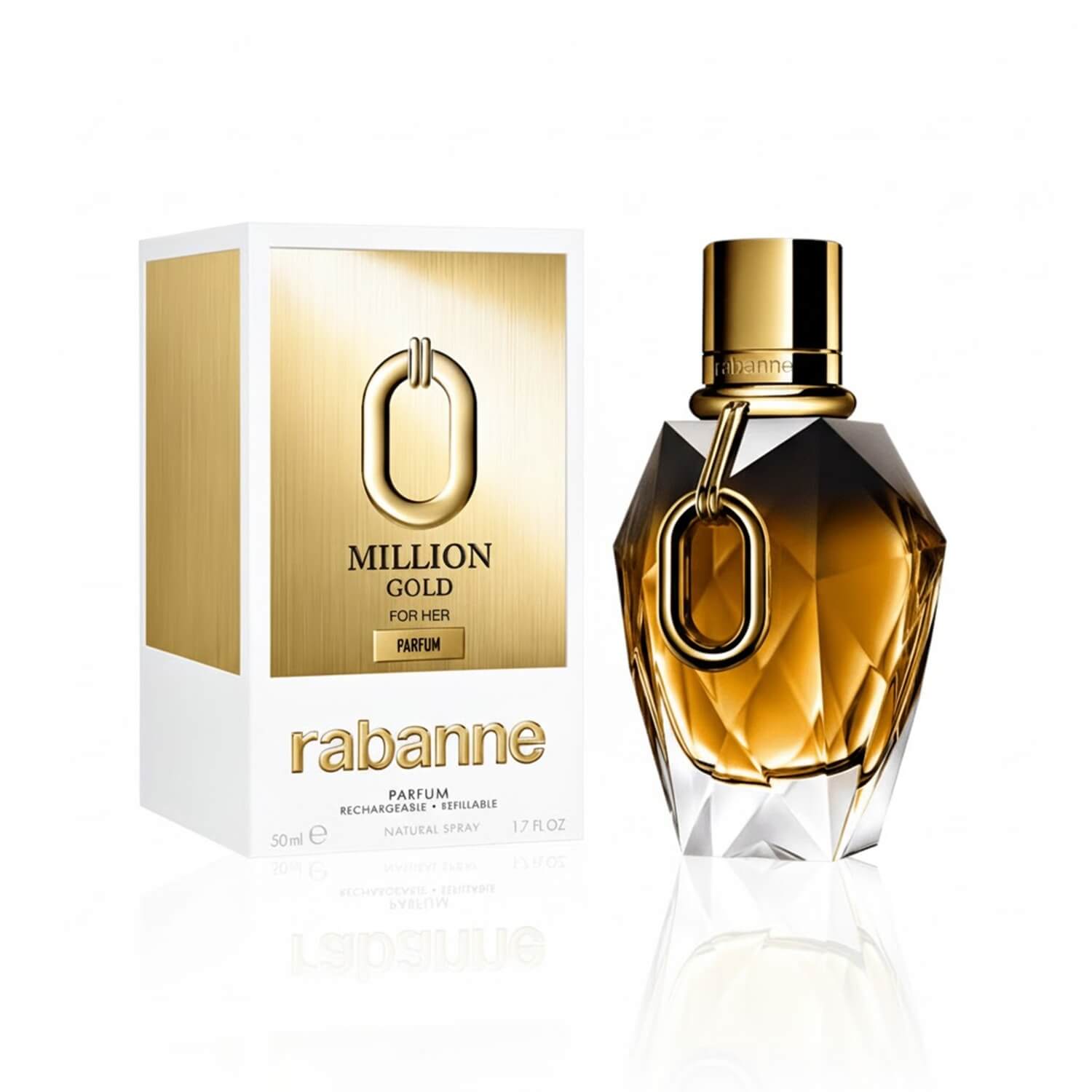 O design de Rabanne 1 Million Gold For Her segue o conceito icônico da linha 1 Million, com acabamento dourado reluzente que simboliza luxo e sucesso.